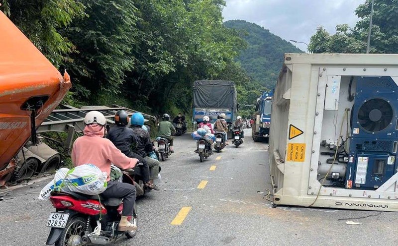 Lam Dong - After nearly 3 hours of effort, the scene of the container truck overturning across the road on Bao Loc Pass has been basically cleared, traffic has returned to normal.