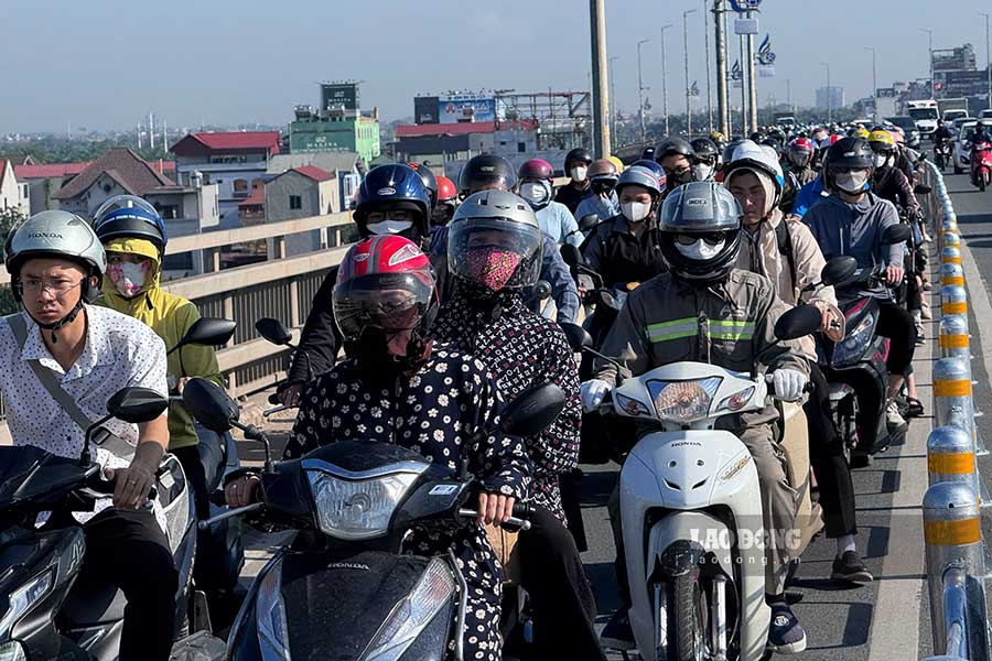 Traffic jam on Nhat Tan bridge after installing iron fences to separate lanes