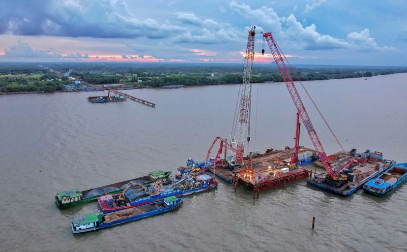 Soc Trang - At the Dai Ngai 1 bridge construction site, contractors are urgently constructing, aiming to complete the second largest cable-stayed bridge in Vietnam.