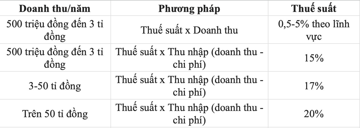 This method is mandatory for individuals with revenue over 3 billion VND per year. In which, if revenue is over 3 billion VND to 50 billion VND, a tax rate of 17% will be applied. If revenue exceeds 50 billion VND per year, the tax rate applied is 20%.