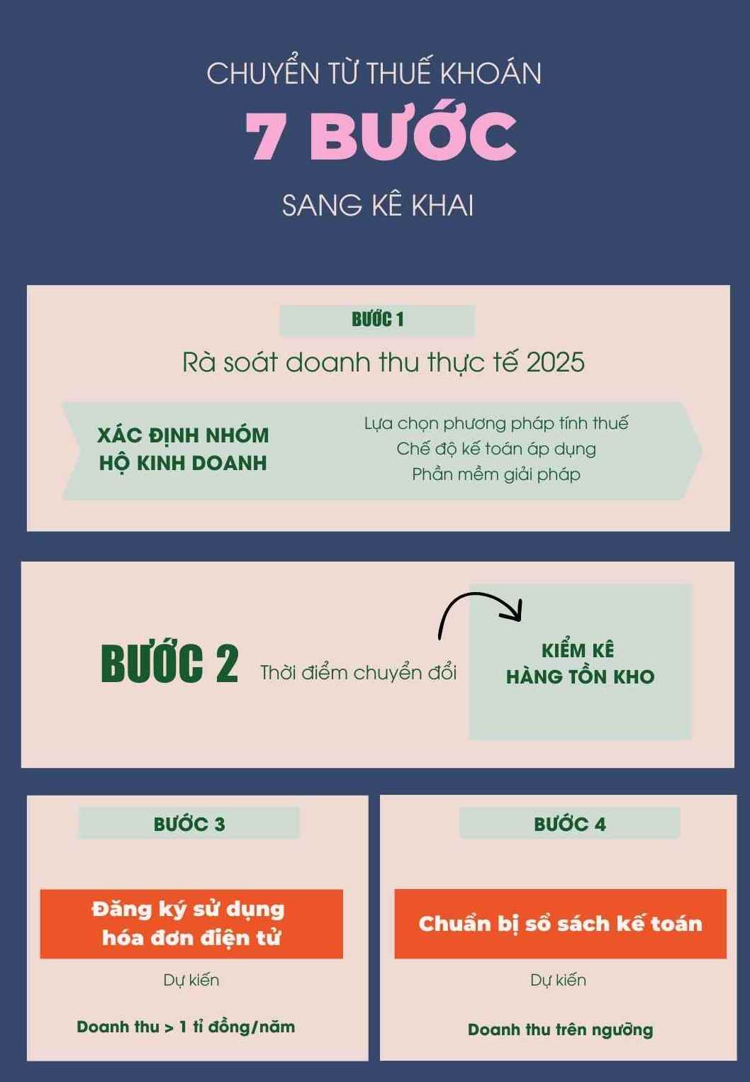 Step 1: All business households need to review the actual revenue in 2025, estimated revenue in 2026, and identify the Business Household group. At the same time, based on the business operation model to choose tax calculation methods, applicable accounting regimes, software solutions for sales, accounting, invoices, and tax declarations corresponding to the scale of the group.