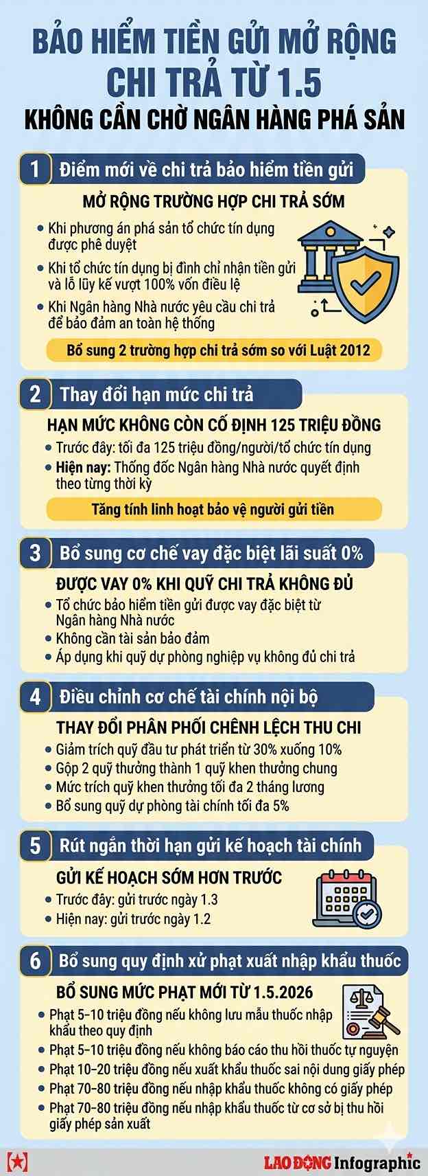 From May 1, 2026, many new regulations on deposit insurance officially take effect under the 2025 Deposit Insurance Law and Circular 33/2026/TT-BTC, in which the expansion of cases of early insurance payment, adjustment of the mechanism for determining payment limits and supplementation of liquidity support tools for deposit insurance organizations are noteworthy.