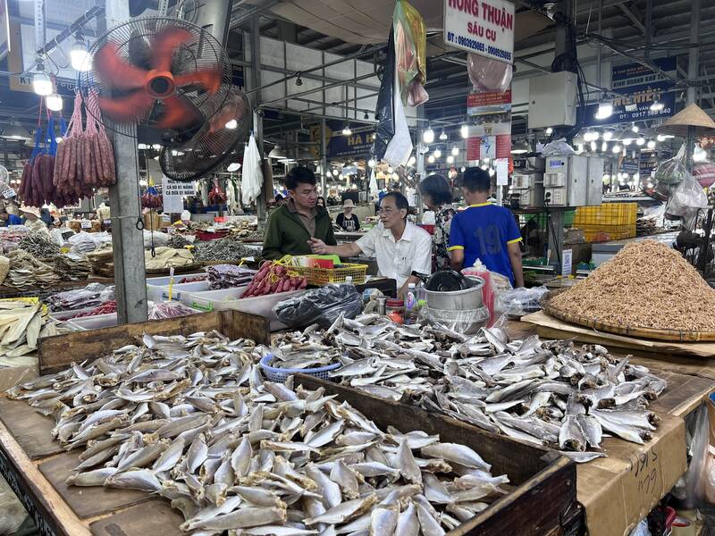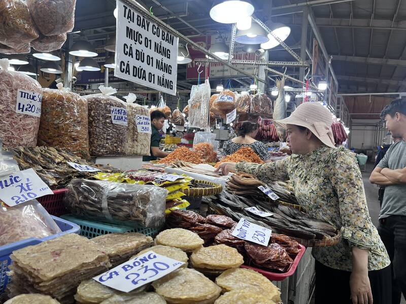 Many people take advantage of shopping early to avoid overload in the days leading up to Tet. Ms. Dang My Hanh (Binh Dong ward) said that every year her family goes to Binh Dien market to buy dried goods. "There are many goods here, you can choose good ones, and the price is also more affordable than buying retail compared to outside. This year I bought dried shrimp, dried squid and a little dried snakehead fish to treat guests" - Ms. Hanh said.