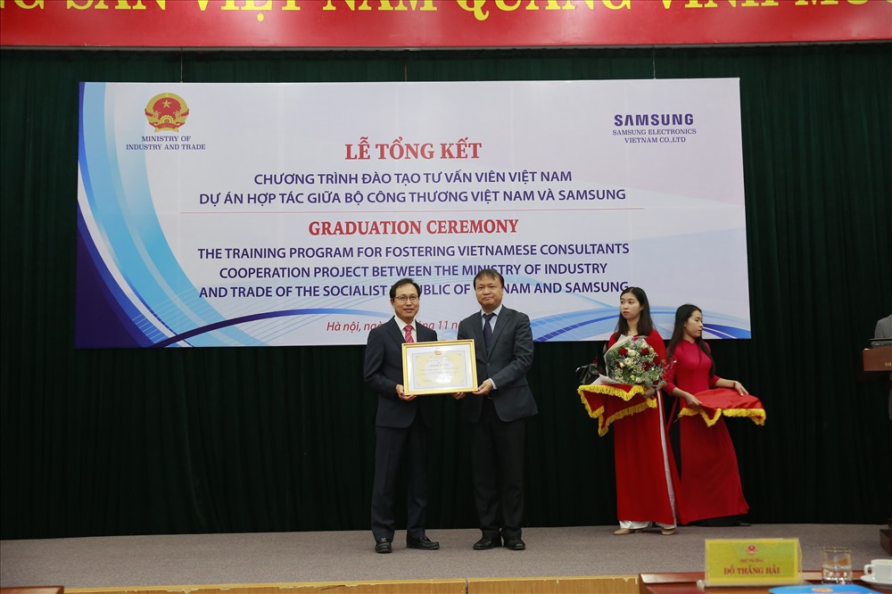 Sáng 15.11, Bộ Công Thương phối hợp với Samsung Việt Nam tổ chức Lễ tổng kết Dự án Hợp tác đào tạo tư vấn viên Việt Nam trong lĩnh vực cải tiến sản xuất và nâng cao chất lượng doanh nghiệp trong hai năm 2018 và 2019.