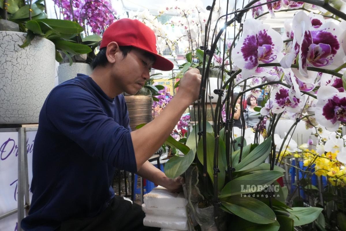 The demand for buying orchids increases sharply during Tet, skilled flower arrangers like Mr. Tu can work up to 10-12 hours a day. Each bouquet of flowers he receives a flower arrangement price of 15,000-20,000 VND/bouquet. His main job is to receive orders, advise customers to buy, create shapes and pot large orchid pots.