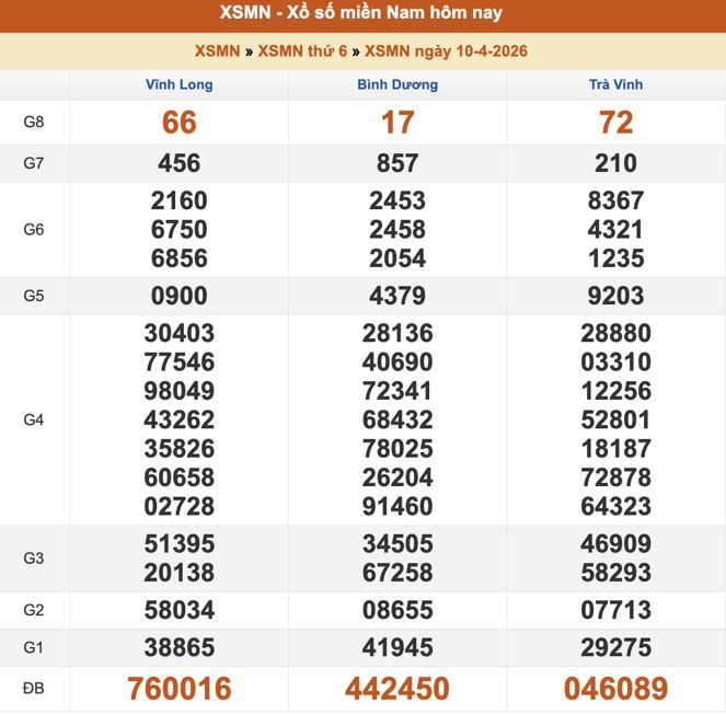 Southern lottery results, April 10, will be updated by Lao Dong Newspaper when lottery companies announce the results at 4:30 PM.