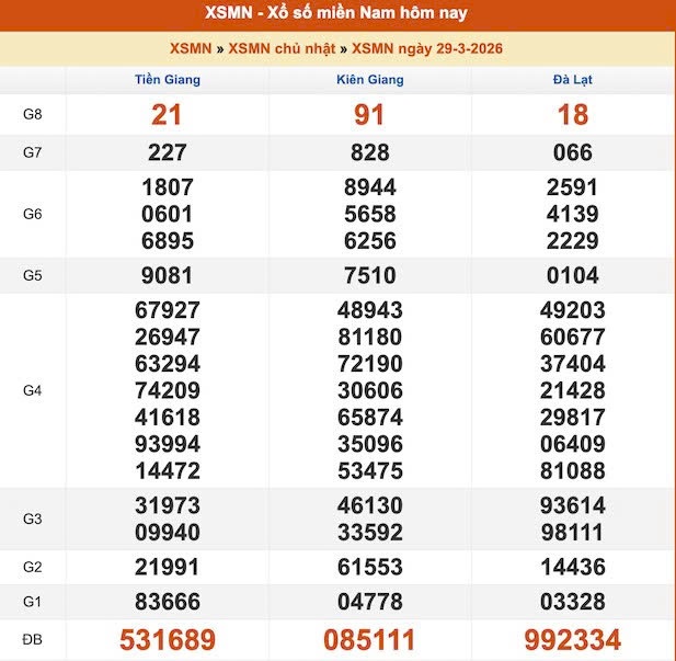 Southern lottery results, March 29th, will be updated by Lao Dong Newspaper when lottery companies announce the results at 4:30 PM.