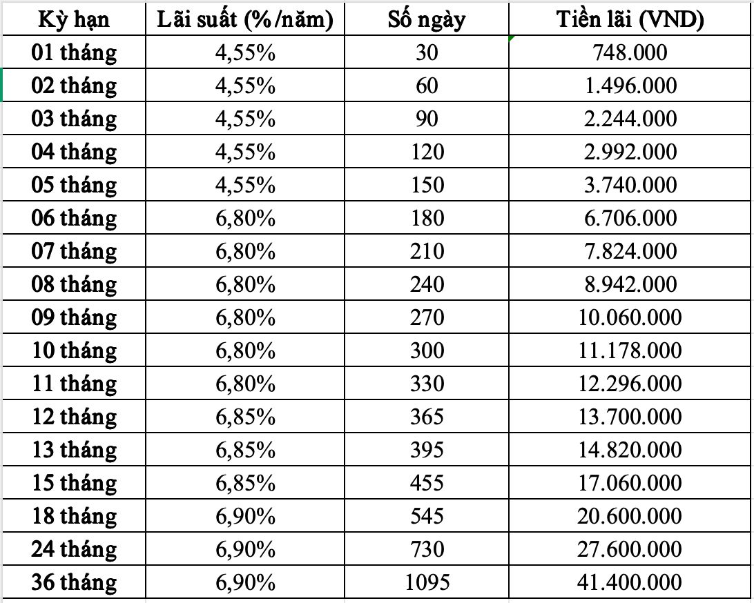 Thus, depositing 200 million VND at Bac A Bank, customers can receive the highest interest rate as follows: