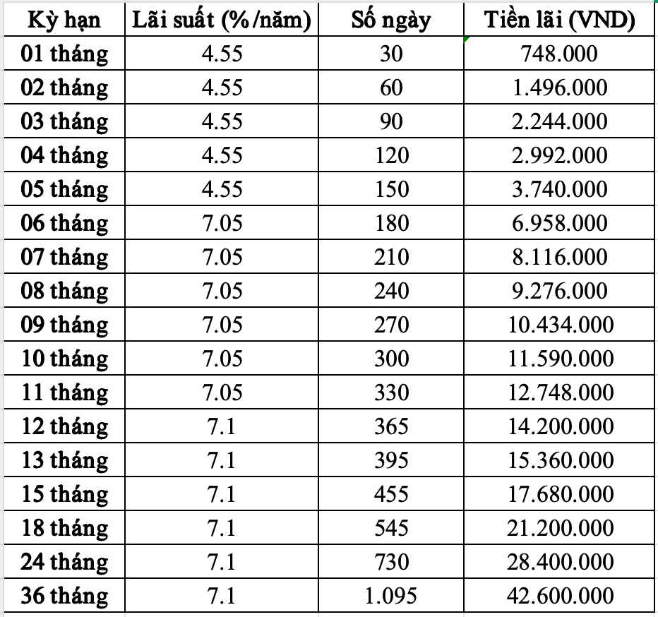 Thus, depositing 200 million VND at Bac A Bank, customers can receive the highest interest rate as follows: