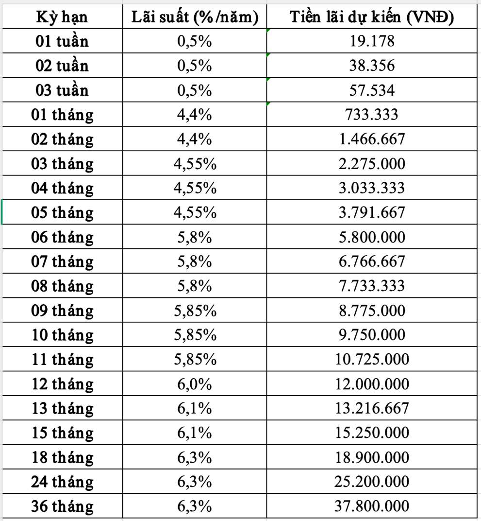 Accordingly, the deposit account under 1 billion VND, receiving interest at the end of the term, 1-2 month term has now increased to 4.4%/year - the highest level on the market today for these two terms.