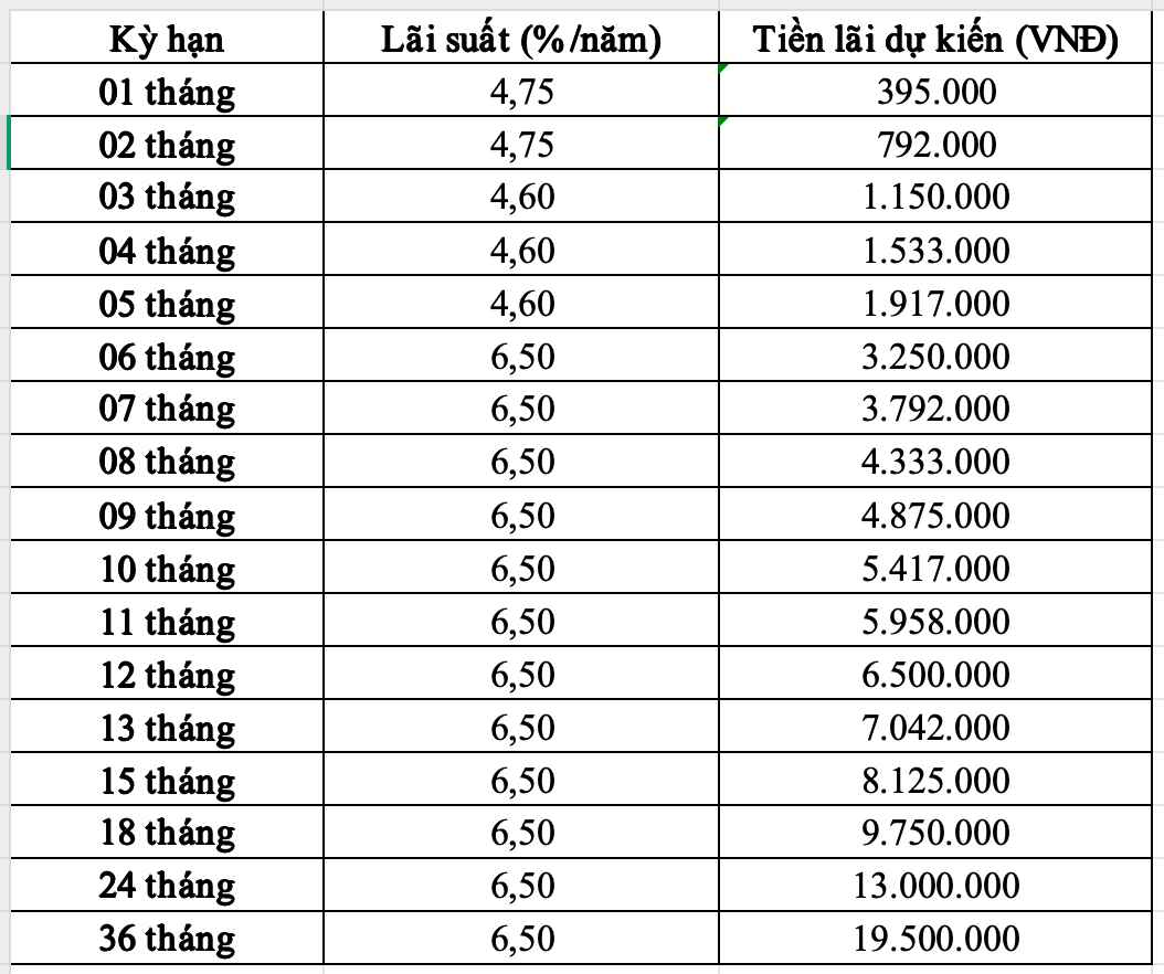 The analysis table below shows the actual interest expected when depositing 100 million VND online at Cake by VPBank: