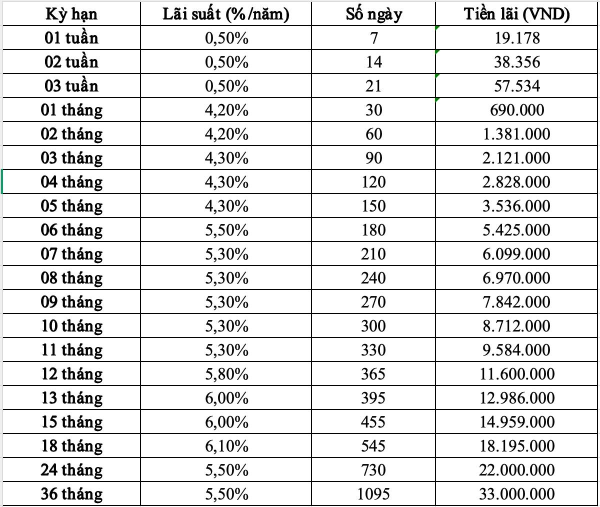 Thus, with a term of 36 months, the amount of interest received is up to 33 million VND.