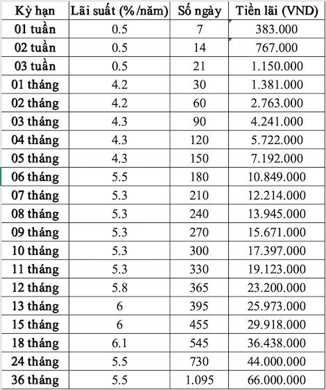Thus, with a term of 36 months, the interest you receive is up to 66 million VND.
