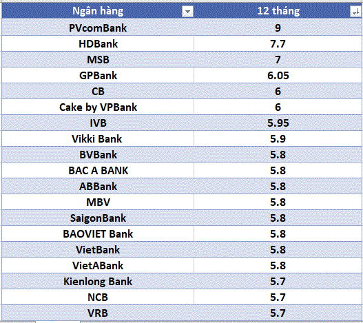 VRB and Dong A Bank apply an interest rate of 6% for a 24-month term; VietABank applies an interest rate of 6% for a 18- and 24-month term at 6%/year, 6.1% for a 36-month term; SaigonBank applies an interest rate of 6% for a 13, 18 and 24-month term, 6.1% for a 36-month term; HDBank applies an interest rate of 6% for a 15-month term and 6.1% for a 18-month term; BAOVIET Bank applies an interest rate of 6% for a 15, 18, 24 and 36-month term; ABBank applies an interest rate of 6% for a 12-month term; CB applies an interest rate of 6% for terms of 12 months or more.
