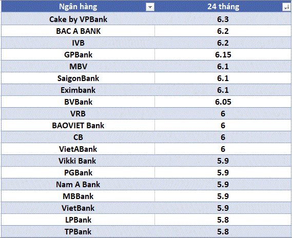 GPBank applies an interest rate of 6.05%/year for a 12-month term and 6.15%/year for terms from 13-36 months. Cake by VPBank applies an interest rate of 6%/year for a term of 12-18 months and 6.3%/year for a term of 24-36 months; OceanBank applies an interest rate of 6.1% for a term of 24 months;