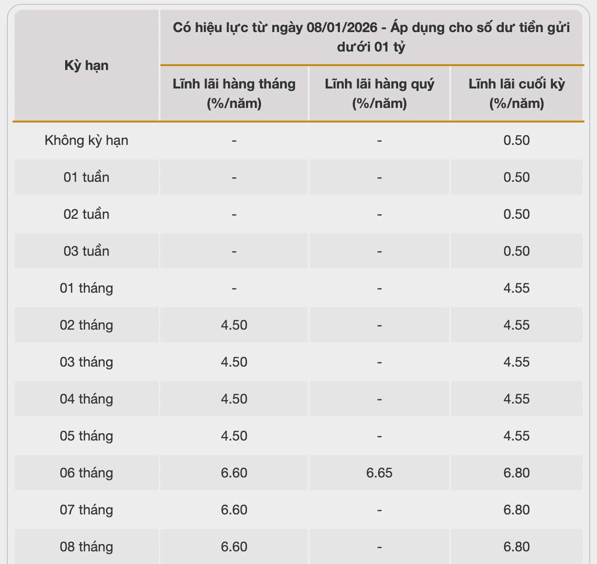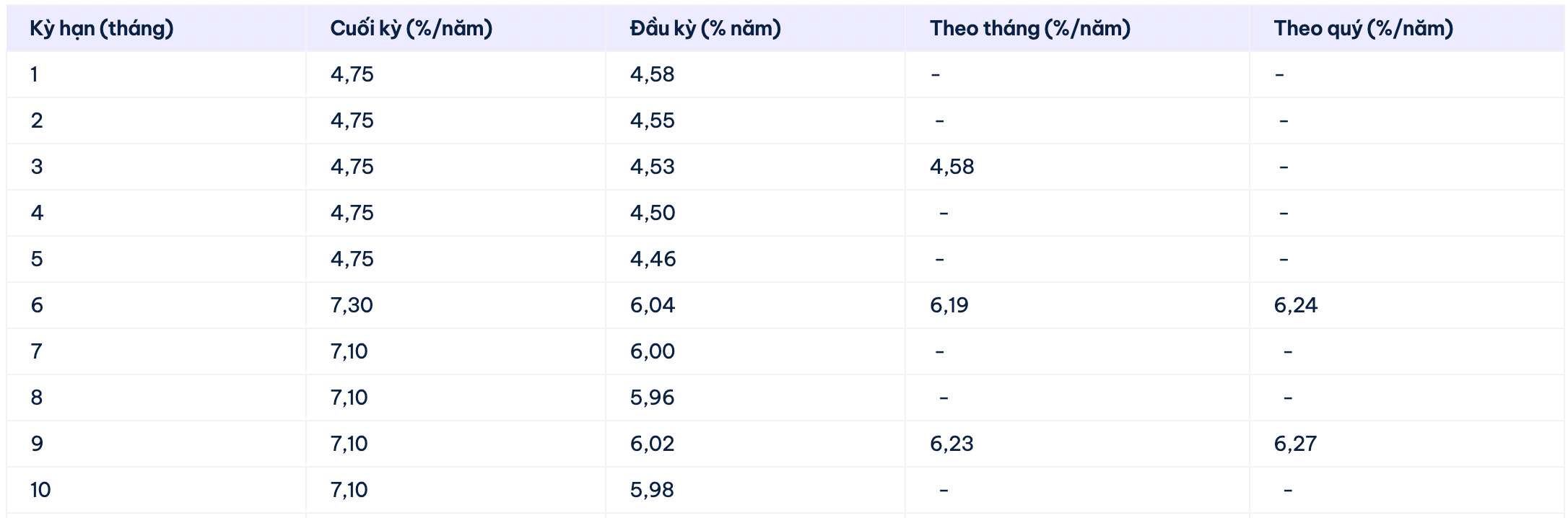 Bac A Bank is listing the highest interest rate for a 13-month term at 6.85% when individual customers deposit money online and receive interest at the end of the term. Currently, Bac A Bank is listing the highest interest rate at 6.9%/year for terms from 18-36 months.