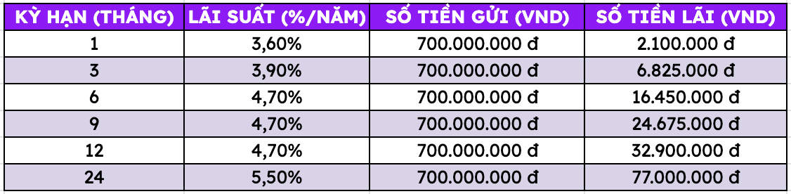 Depositing 700 million VND at TPBank, how much interest will you receive at each term?