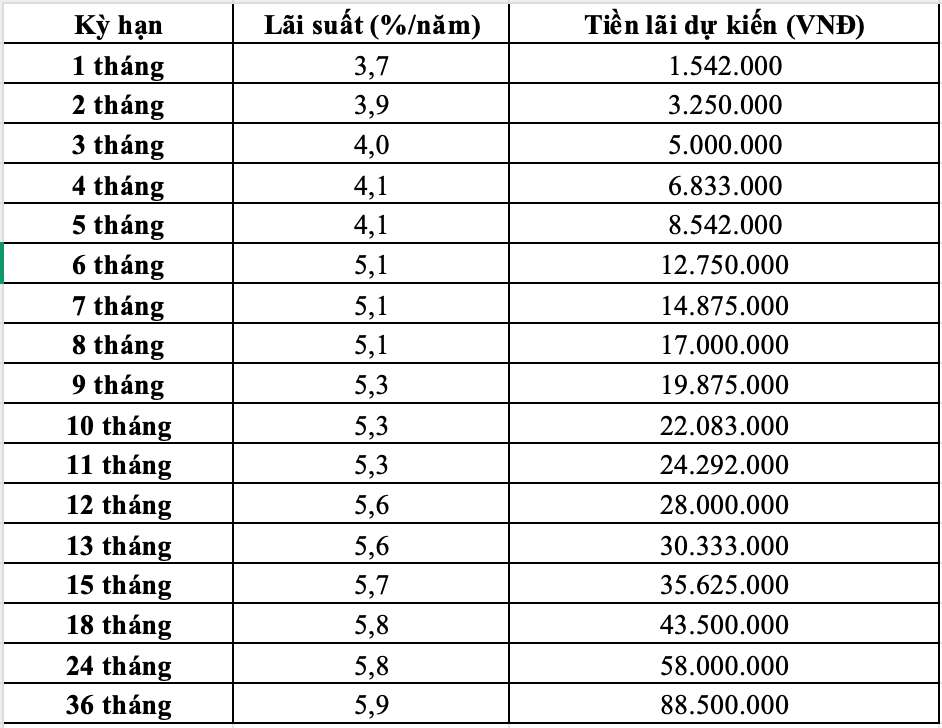 Thus, with a term of 36 months, the interest you receive is up to 88.5 million VND. This is also the term with the highest interest rate at this bank.