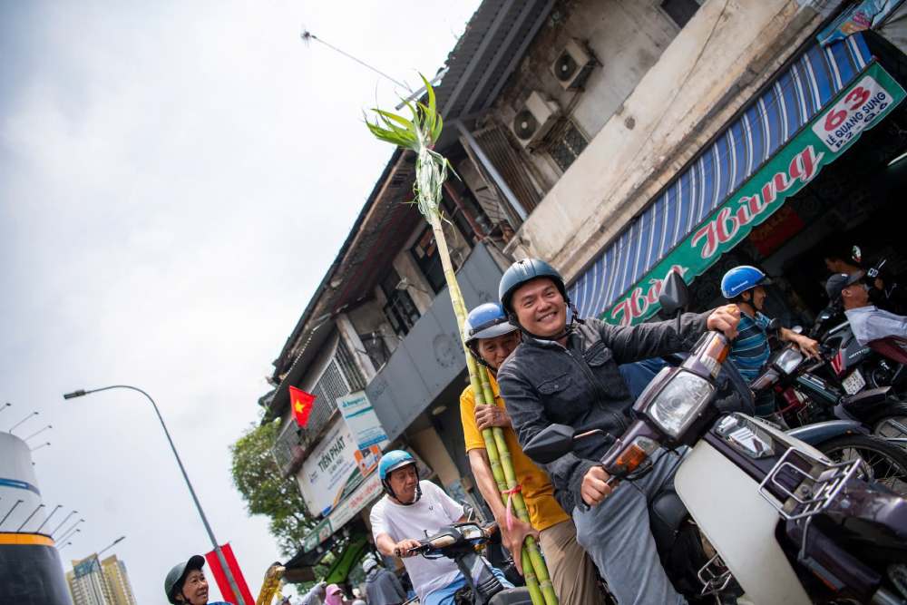 Along the route, dozens of small traders are selling yellow sugarcane - a type of offering considered sacred, symbolizing the ladder to welcome Emperor Emeritus down to earth. Sugarcane here is carefully selected from Western sources: trees are over 2m tall, trunks are large and strong. In particular, the top must still have fresh green leaves to be favored by customers.