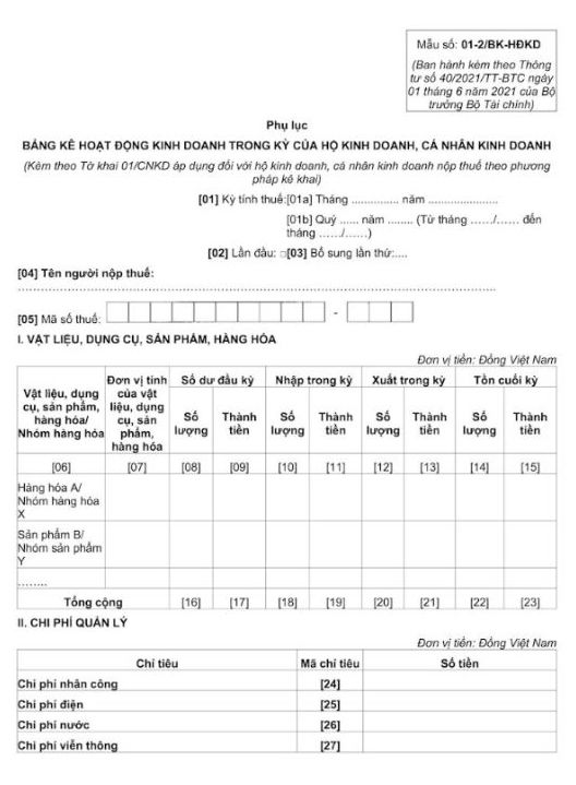 The forms of declaration commonly used for business households specified in the Appendix issued with Circular 40/2021/TT-BTC include: