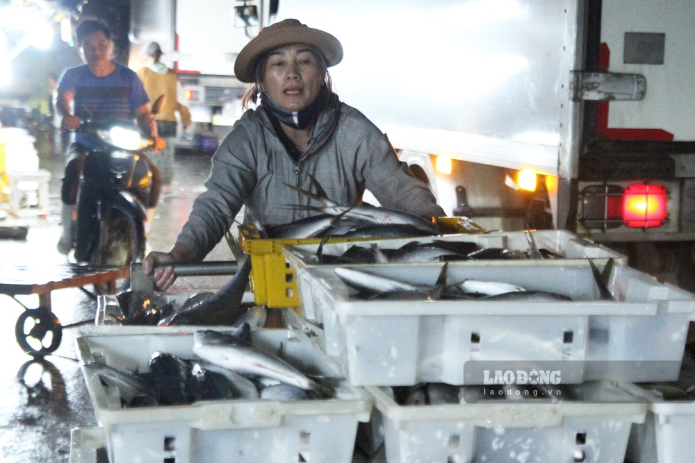 From 7 pm, each fishing boat lined up to dock after many days of going to sea. On the deck, fresh fish had just been transferred to the wharf amidst the joyful laughter of fishermen.