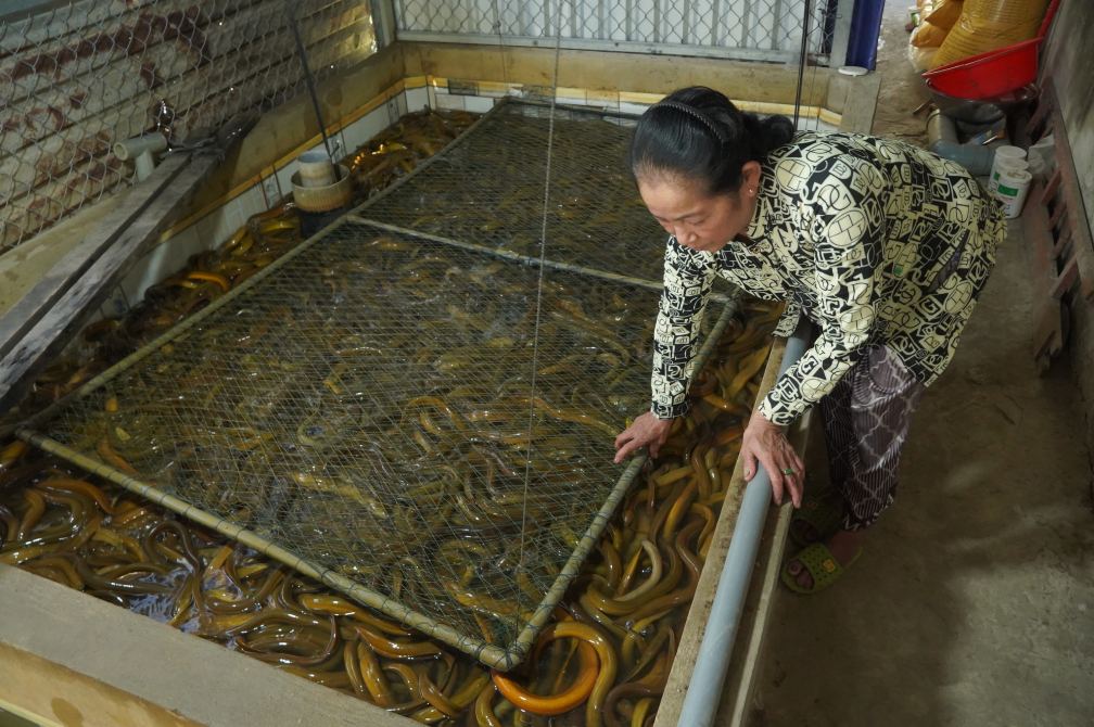 Initially, Ms. Sang only invested in building 2 eel farms. When she saw that the model was effective, she continued to expand and build 3 more farms, bringing the total number to 5 farms. According to Ms. Sang, eel farming is suitable for the family's conditions, does not require much area and can be raised in cycles.