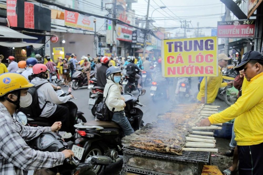 Besides grilled snakehead fish, accompanying items such as giant river prawns, roasted pork... along both sides of the road are also bustling with buyers. The image of people patiently waiting to buy a satisfactory set of offerings has become a cultural beauty, expressing the wish for a prosperous and wealthy new year of city residents.
