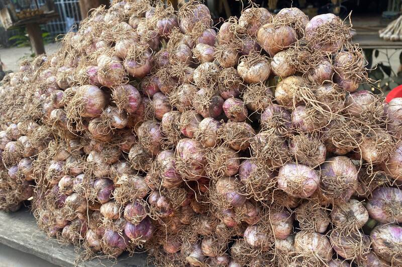 Motorbikes and improved vehicles continuously carry garlic home to dry in time, clearing the plowed land for spring rice cultivation.