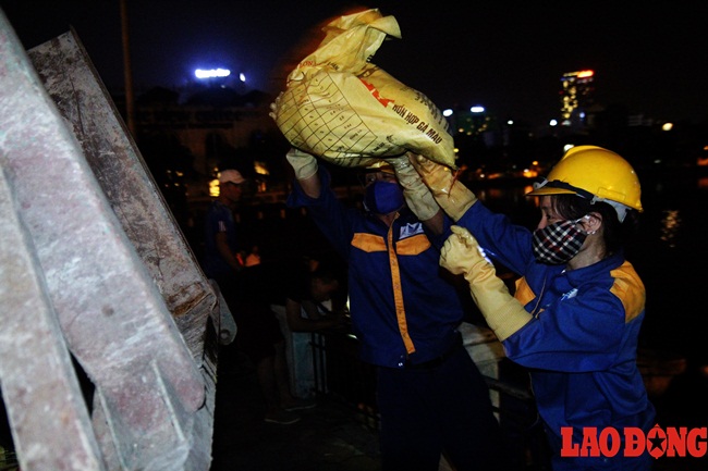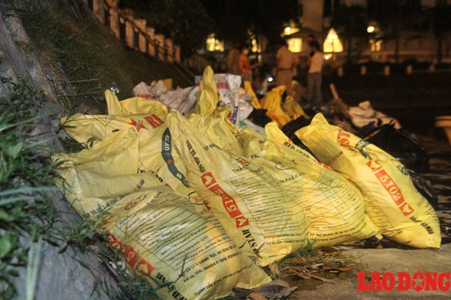 | Hàng chục bao tải cá chết ở hồ Hoàng Cầu được công nhân vớt trong đêm. Ảnh C.N |