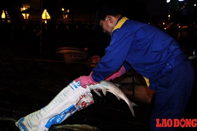 Dưới đây là một số hình ảnh về quá trình vớt và xử lý cá chết ở hồ Hoàng Cầu được PV ghi lại trong đêm 8.6: