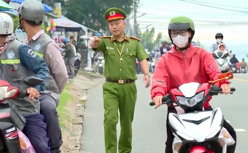 Lam Dong - Police handle the situation of trading and encroachment on the sidewalk in front of the gate of Phan Thiet Industrial Park to ensure the safety of workers.