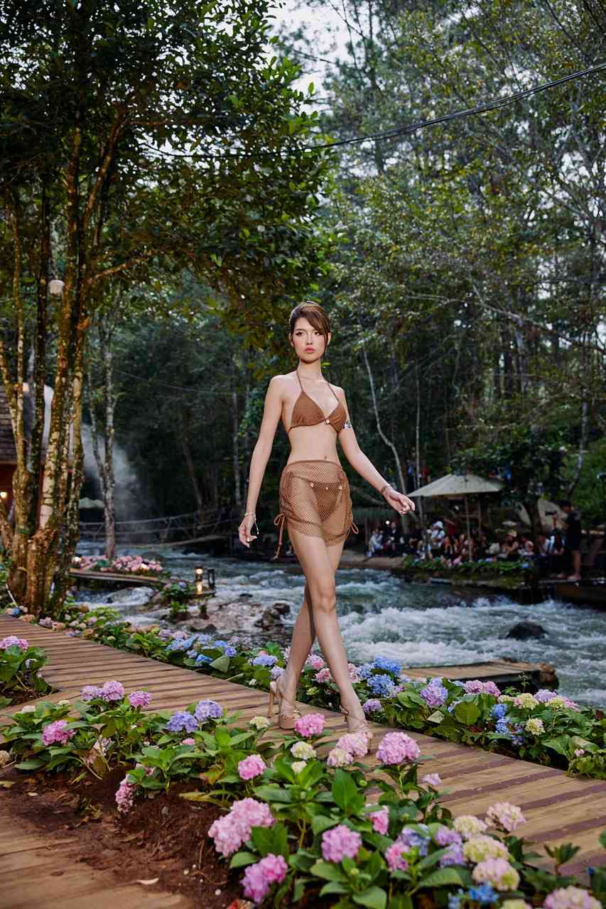 The highlight of the journey is the "swimwear" competition held next to a clear, green stream, the water flowing windy in the middle of the mountains and forests. In the midst of the blooming Cam Tu bridge flower road, the contestants performed energetic catwalks. The toned bodies and clear body lines of the male and female contestants created a strong attraction, making the judges, tourists and the audience constantly cheer.