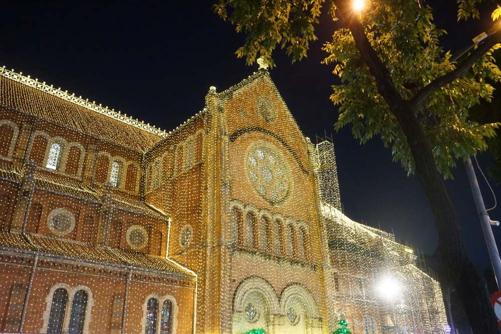 Entering the parish grounds, the space appeared like a fairy tale painting in real life. A series of Christmas trees about 3 m high are arranged densely, each tree is wrapped in sparkling lights, shining brightly.