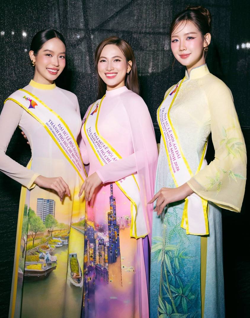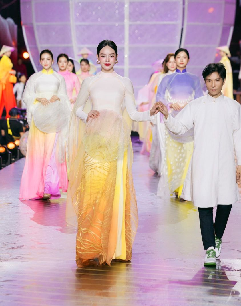 The collection is presented by many prominent faces of the beauty industry such as Huynh Thi Thanh Thuy, Luong Thuy Linh, Tran Tieu Vy, along with Miss Le Hoang Phuong, Doan Thien An and many other beauties. In each step of the performance, the silk ao dai is as soft as cloud strips, highlighting the graceful and luxurious look of the wearer.