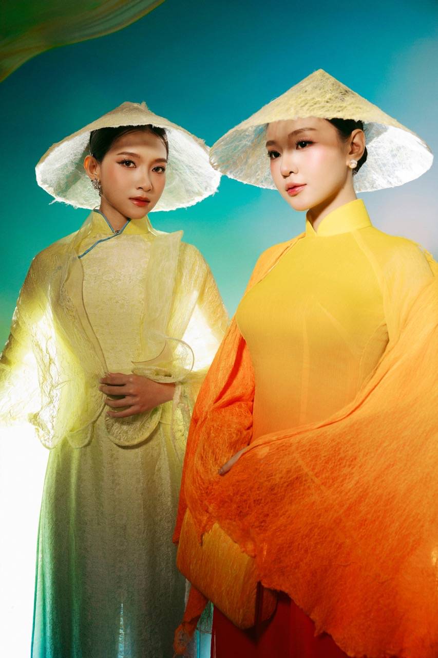 According to Trung Dinh, this project was implemented in a fairly tight time, only about 10 days for two collections. However, he still chose non-woven silk material combined with manual ombre dyeing techniques to create a distinctive color effect.