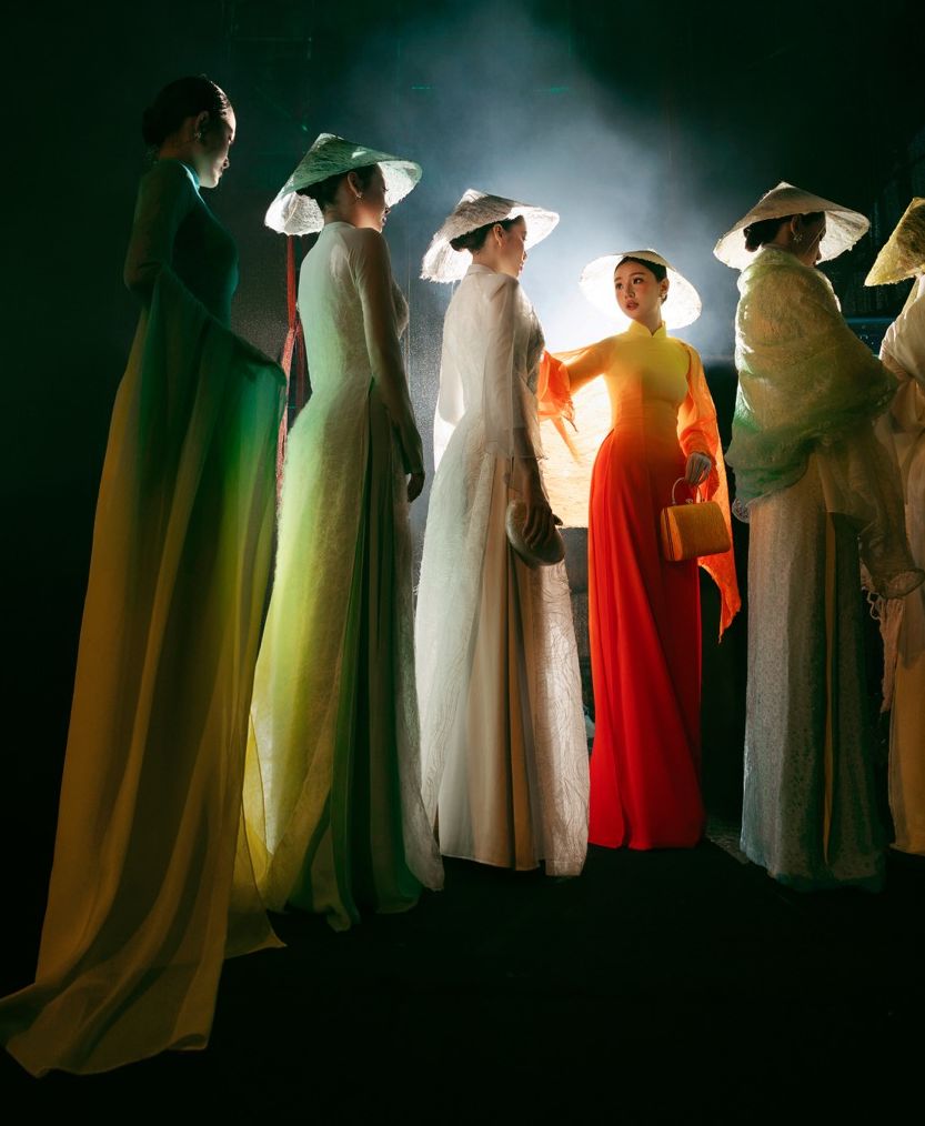 The designs continue to promote the familiar strengths of the designer with ombre dyeing techniques and handcrafted painting on silk, creating traditional, elegant and artistic ao dai.