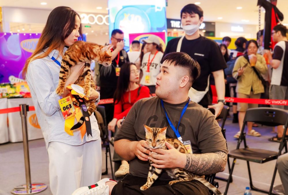 Mr. Vuong Dinh Giap said that this is the second year he and his pet cat have participated. The Maine Coon cat he is holding is valued at around 380 million VND. Photo: Anh TuMr. Phuong Chi Vinh (owner of a Bengal cat farm in Ho Chi Minh City) shared about a 9-month-old Bengal cat breed by his brother according to WCF standards, which was highly appreciated by the judges at the competition.The cats are waiting for their competition. Photo: Thai BaoThe participating cats will go through four rounds of competition with the assessment of international judges, based on criteria such as appearance, weight, personality and ability to compete. Photo: Thai Bao.Miss Cat won prizes at the contest. Photo: Thai Bao.