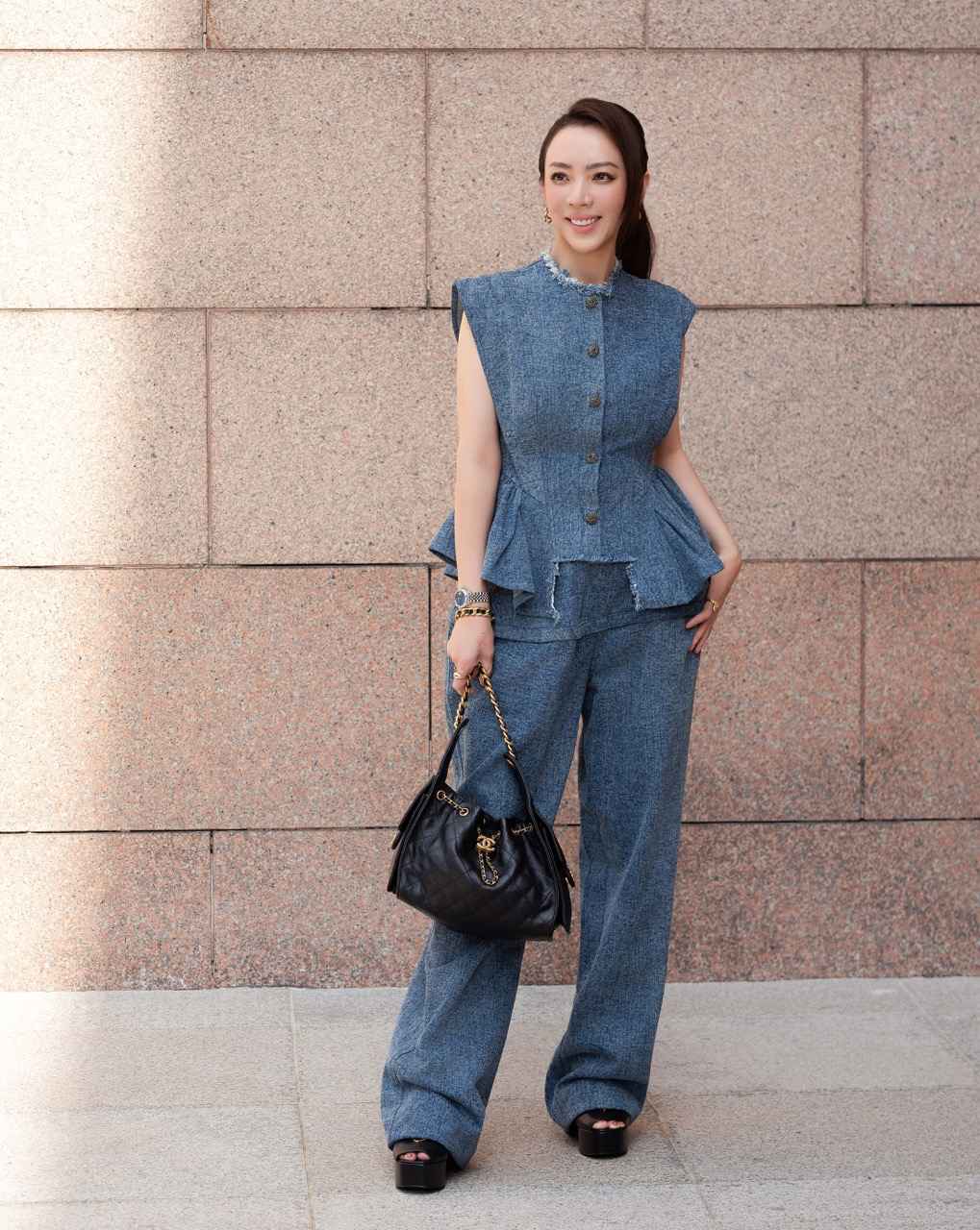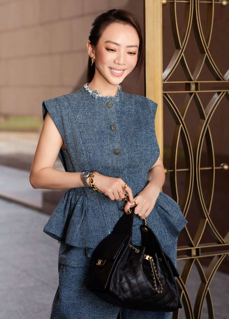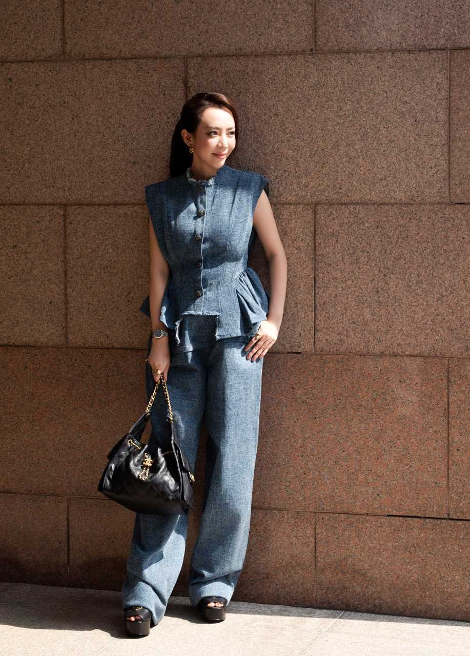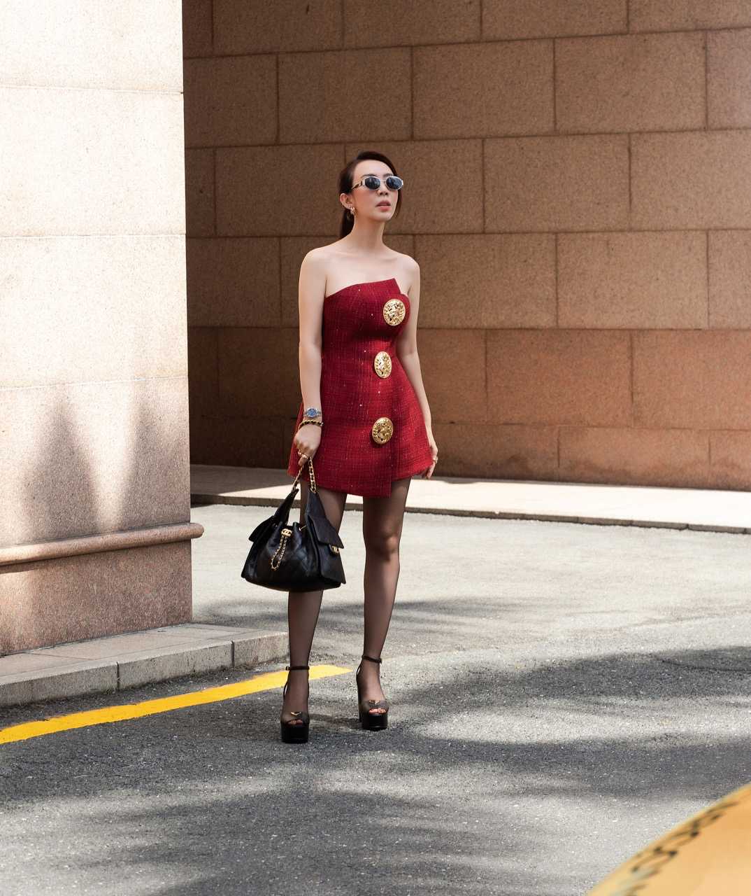 In the photo series, she wore a red dress to show off her slim figure and was toned thanks to her perseverance in sports. costumes such as deep-fitting black vests, short dresses combined with black socks or modern denim sets help female artists to be elegant, dynamic, and youthful.