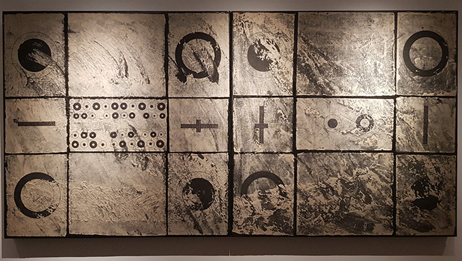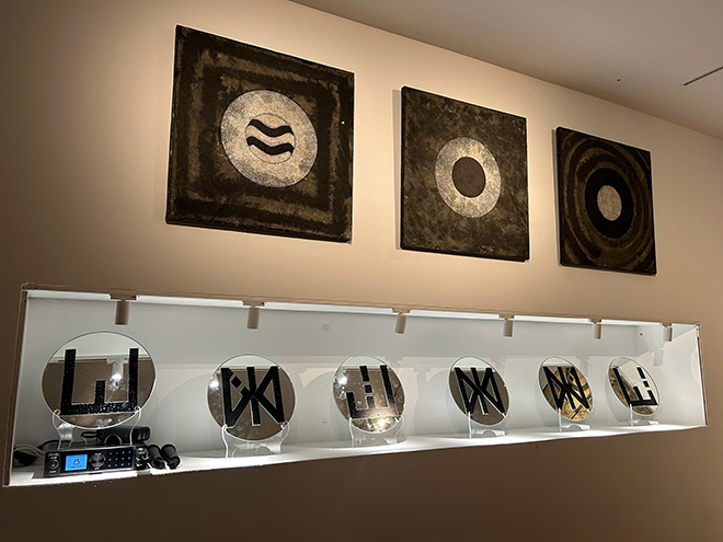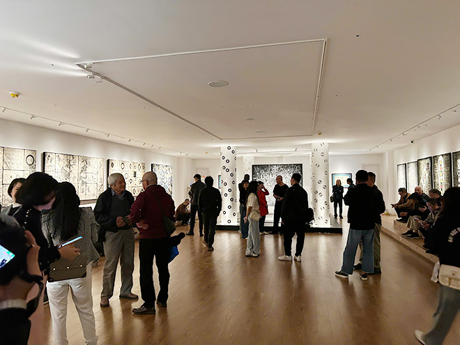 The exhibition displays 30 large-sized paintings on Do bao paper on tarpaulins, ink, color... and more than 2,000 pieces of hanging symbols with 318 round mirrors with surface figures, lighting and Yin-yang items for a small arrangement, but the system dominates the exhibition space.
