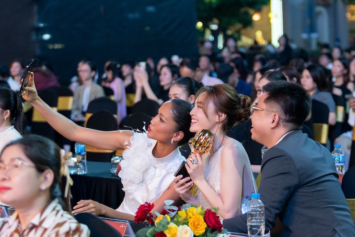 Right after the show's closing ceremony, H'Hen Nie quickly changed her hairstyle and put on a white dress by designer Linh San, taking advantage of the time to hold her dress and "run a marathon" to be on time for the event 500m away. H'Hen Nie said she had asked the organizers for permission to be late, because both events were very important to her, so she tried to arrange to attend both events. She quickly sat next to actress Ninh Duong Lan Ngoc and watched and supported the music performances, individuals, and groups going on stage to receive awards.