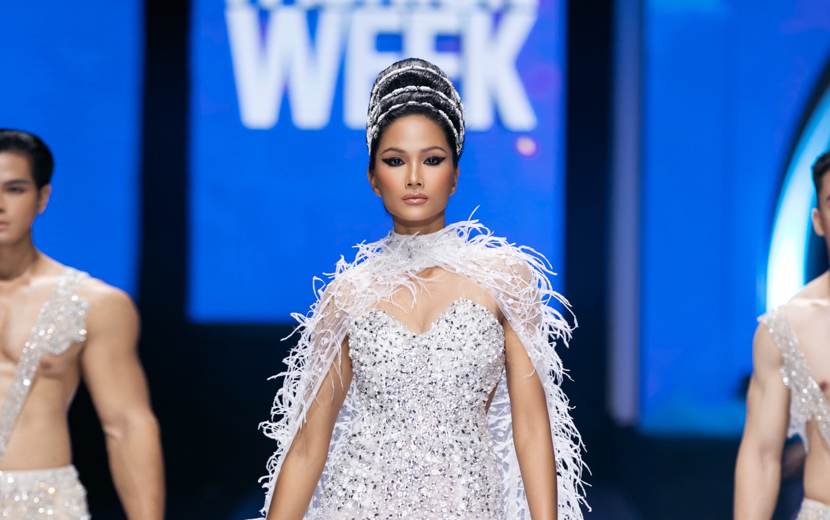 Hoa hậu H'Hen Niê đã mất hơn 1 tiếng đồng hồ chỉ để làm mái tóc trong buổi diễn tại Tuần lễ thời trang Quốc tế Việt Nam.