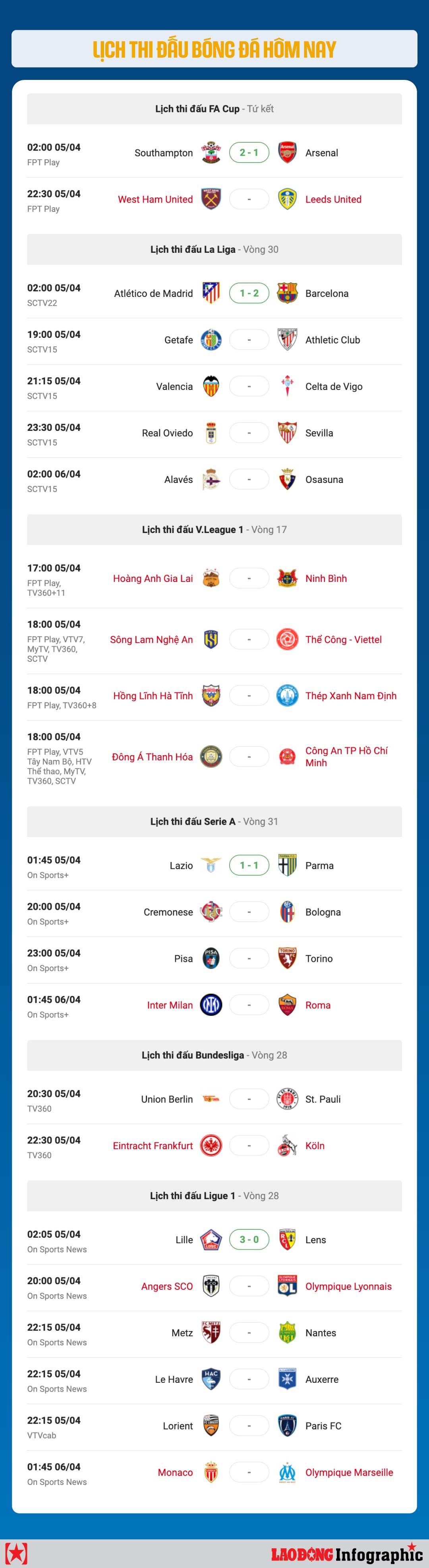 FA Cup, La Liga, V-League football schedules are attractive tonight and early tomorrow morning April 6, 2026.