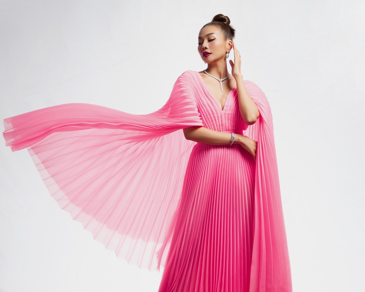 Supermodel Thanh Hang's outfit is dominated by blue with an impressive style of wide flared sleeves and large pleated skirt.