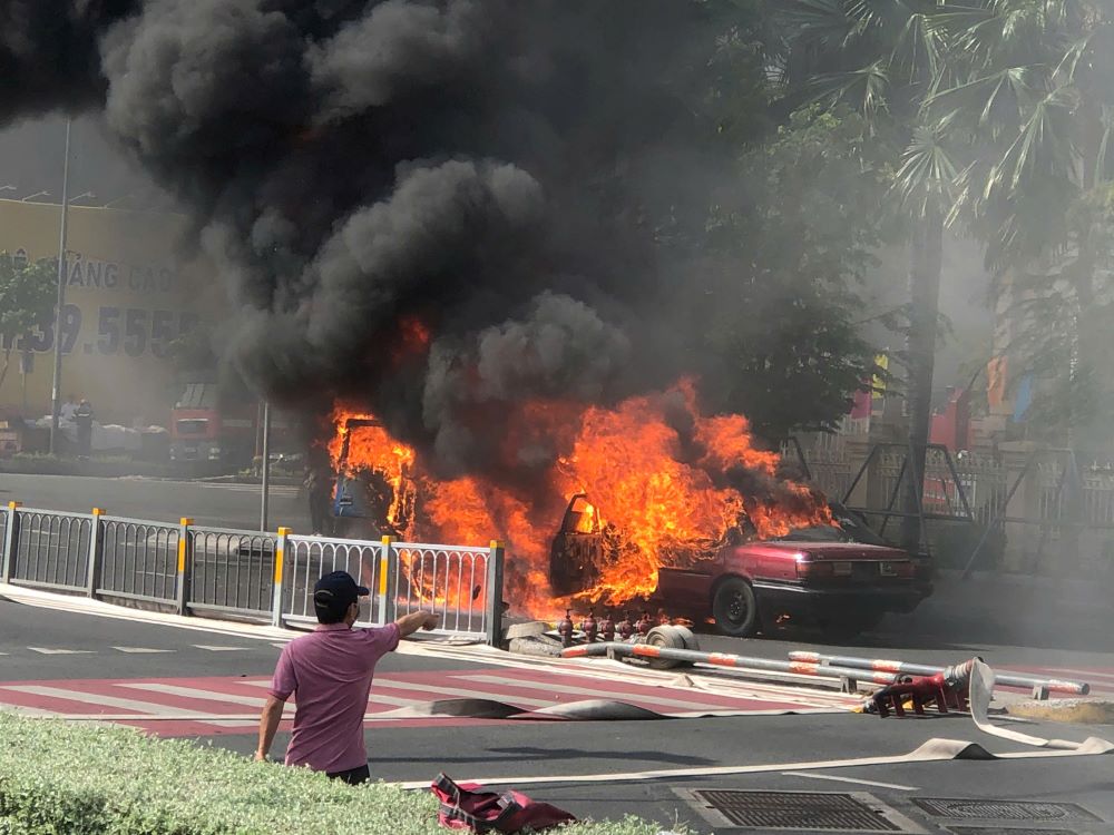 Not stopping there, at the intersection of Ton Duc Thang Street, a serious traffic accident occurred between two cars and a chemical truck. The accident deformed the vehicles, trapping 4 people inside. Fuel leakage from the vehicle met the heat source and caused a fire, while the strong collision caused the chemical truck to have a blown tire, tilt the vehicle, and break the plastic cans containing chemicals, creating a serious risk of fire and pollution.