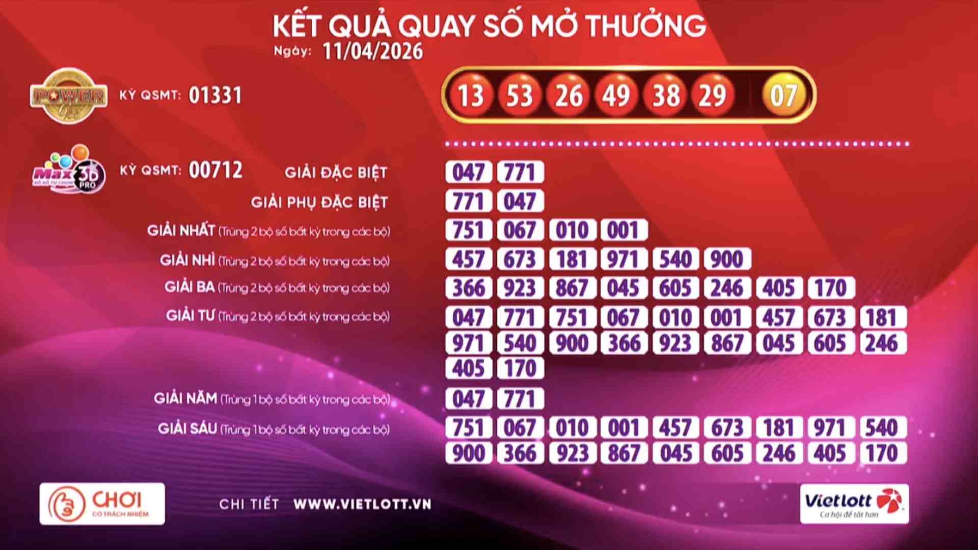 Results from Vietnam Computer Lottery Company (Vietlott) show that in the 01331st drawing of Power 6/55 lottery type on April 11, 2026, the special lucky number series in the 01331st drawing of Power 6/55 lottery product today is: