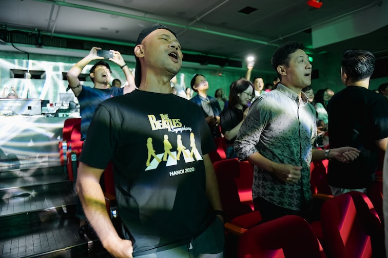 MC Anh Tuan and Long Vu sing enthusiastically with Bootleg Beatles