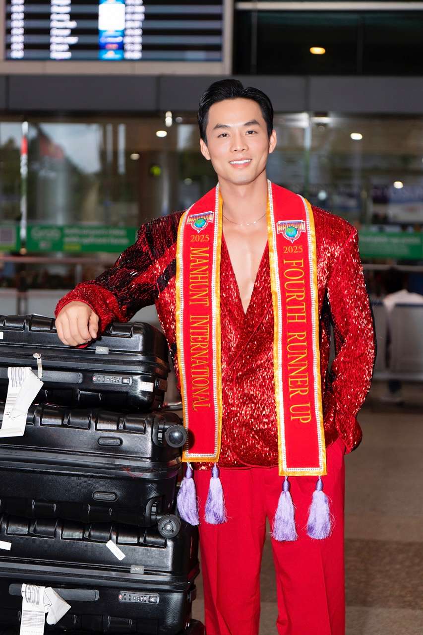 Vu Linh said that after winning the Manhunt International runner-up title, the Top 5 best contestants have carried out many communication activities in Bangkok, so he had to postpone his flight schedule to return home. At the airport, Vu Linh appeared prominently in a red suit made by designer Ngo Manh Dong, continuously smiling brightly despite having just experienced a long flight.