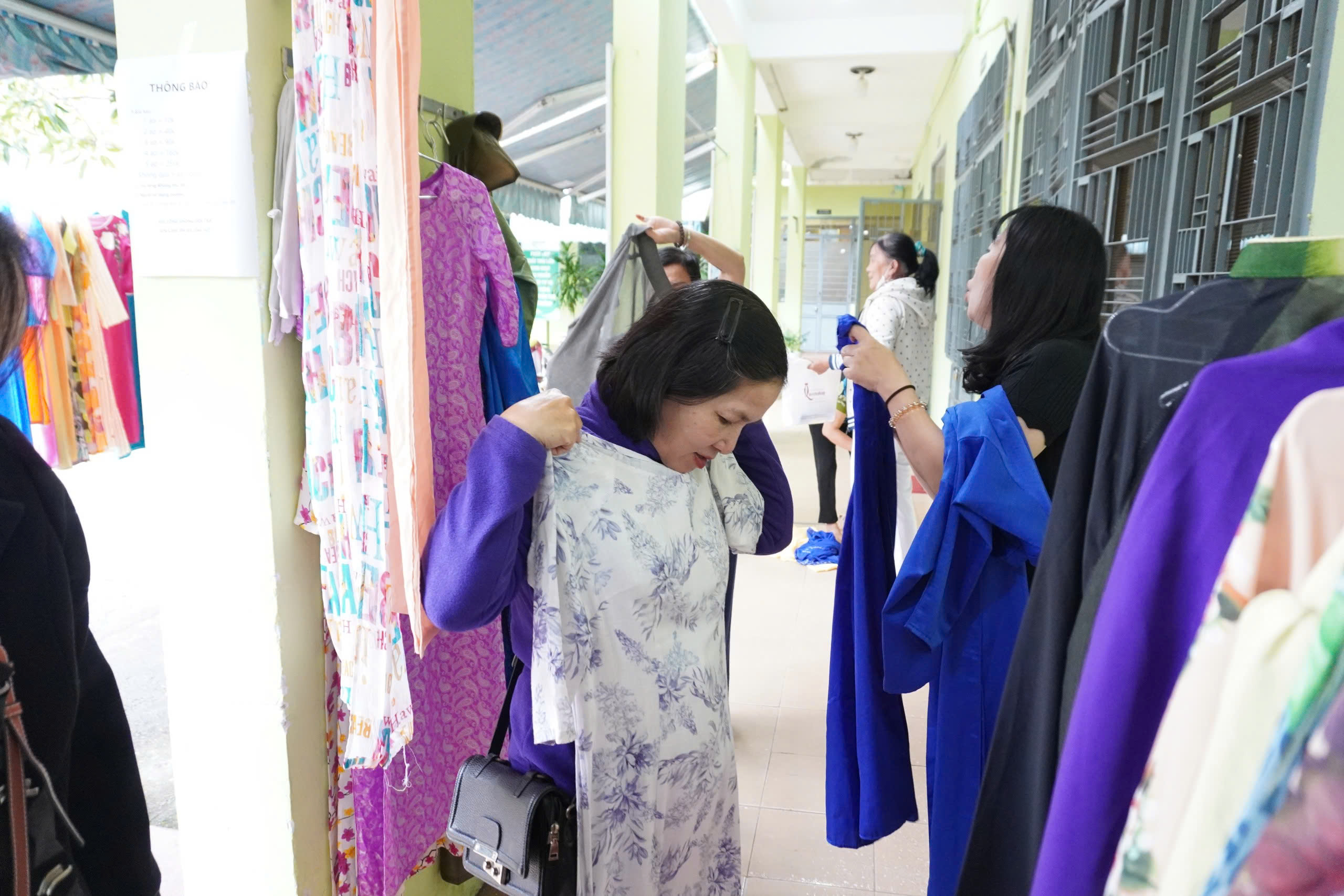 At the program, hundreds of ao dai with many colors and designs were hung neatly on the shelves. These are gifts donated by women in the ward, sending the spirit of sharing to the community. Market-goers are free to choose a shirt that suits their figure and preferences.
