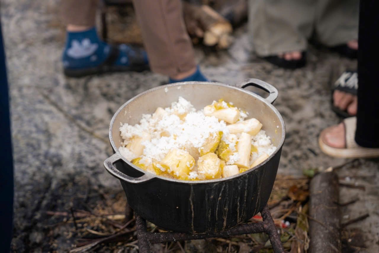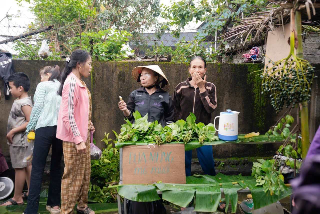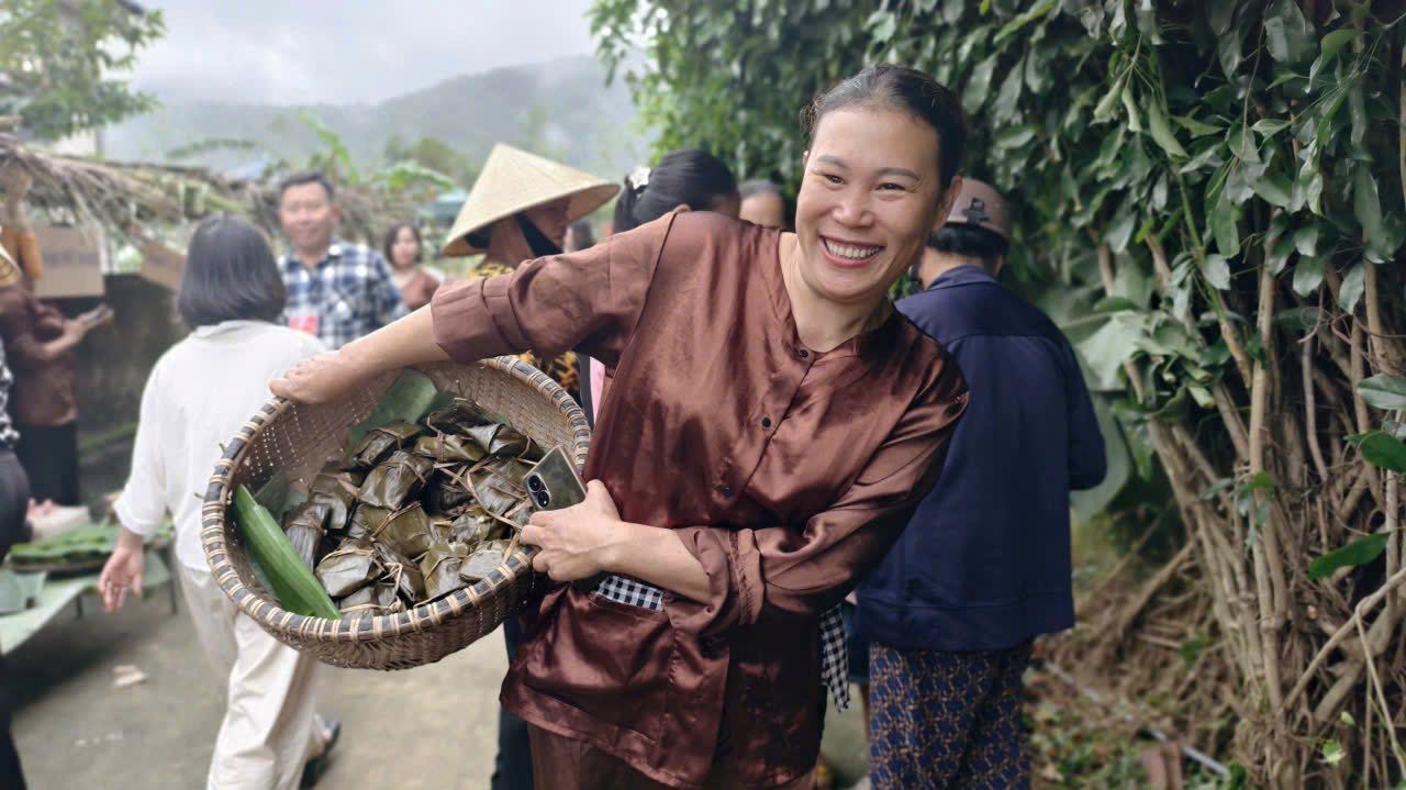The market space recreates the rustic, rural scene with rustic products such as cakes, tea, agricultural products... being sold in the traditional way. The price of each item is only symbolic, about 2,000 VND, demonstrating the spirit of sharing and community solidarity.