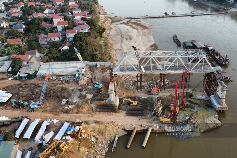 Phu Tho - On the 29th of Tet, the construction site of the new Phong Chau bridge and the dismantling and clearing of the old bridge were still under construction, the sound of machinery resounded throughout the area.